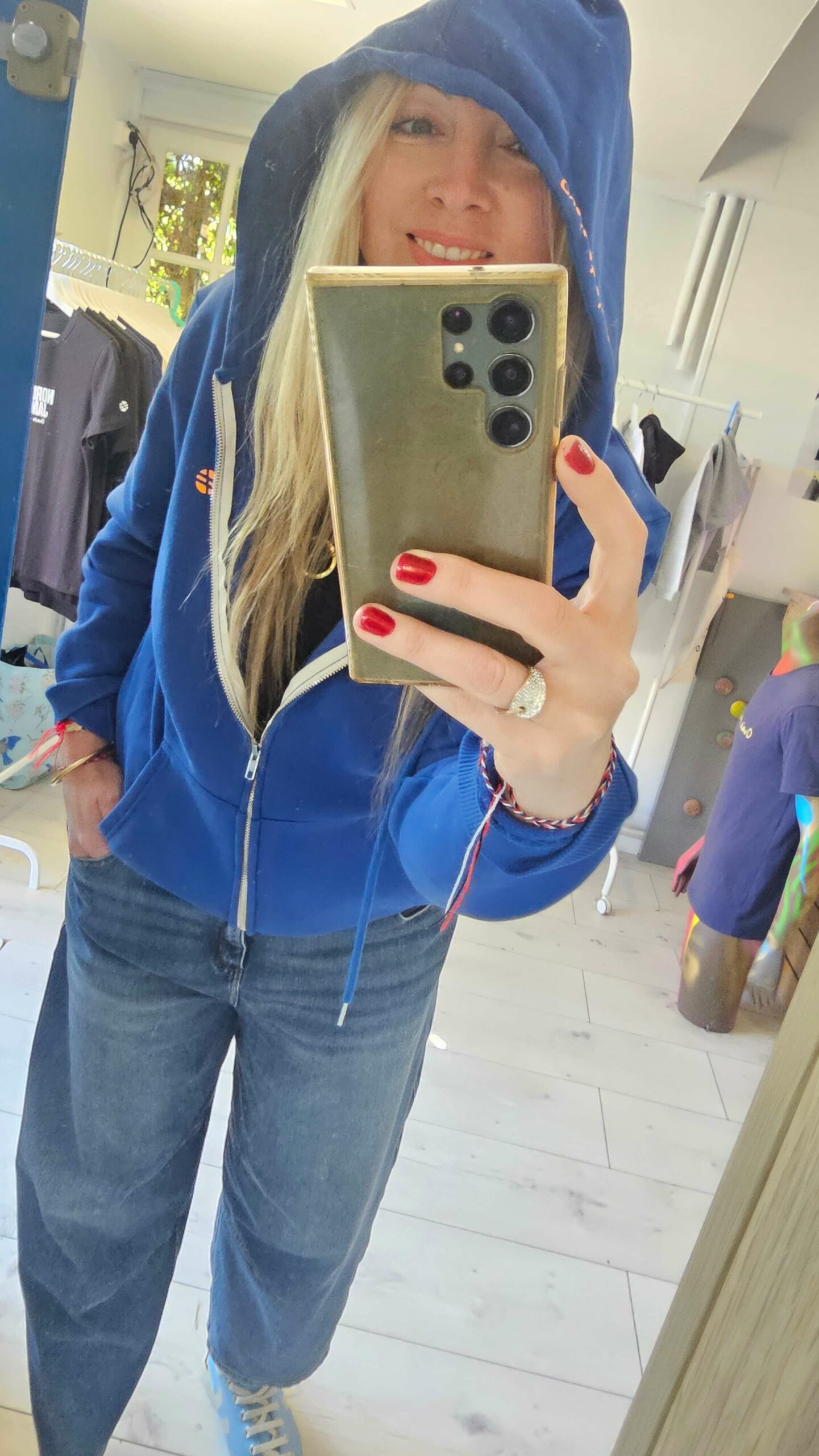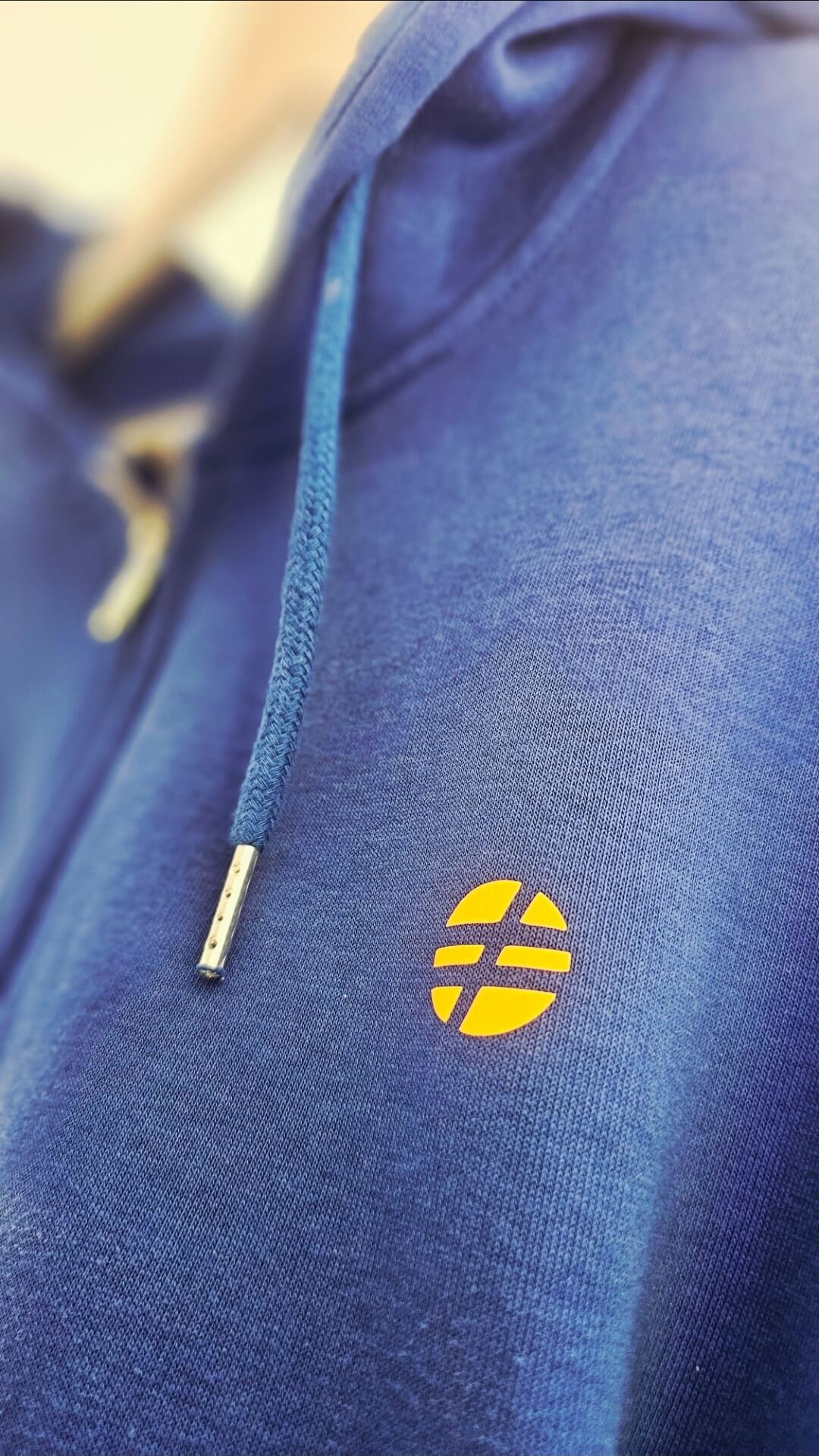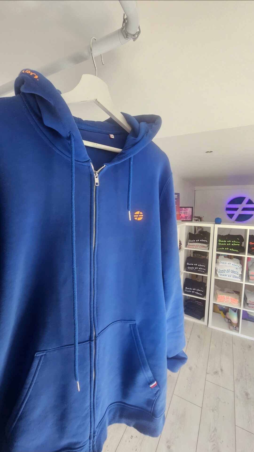 Gilet molletonné zippé LE ROYAL ZIP, unisexe, bleu royal, floqué orange fluo, confectionné de façon responsable, en France.