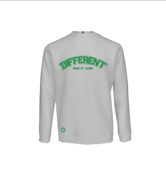SWEAT GRIS UNISEXE, floqué vert « Différent Ouais et alors » police « collège américain », confectionné de façon responsable, en France.