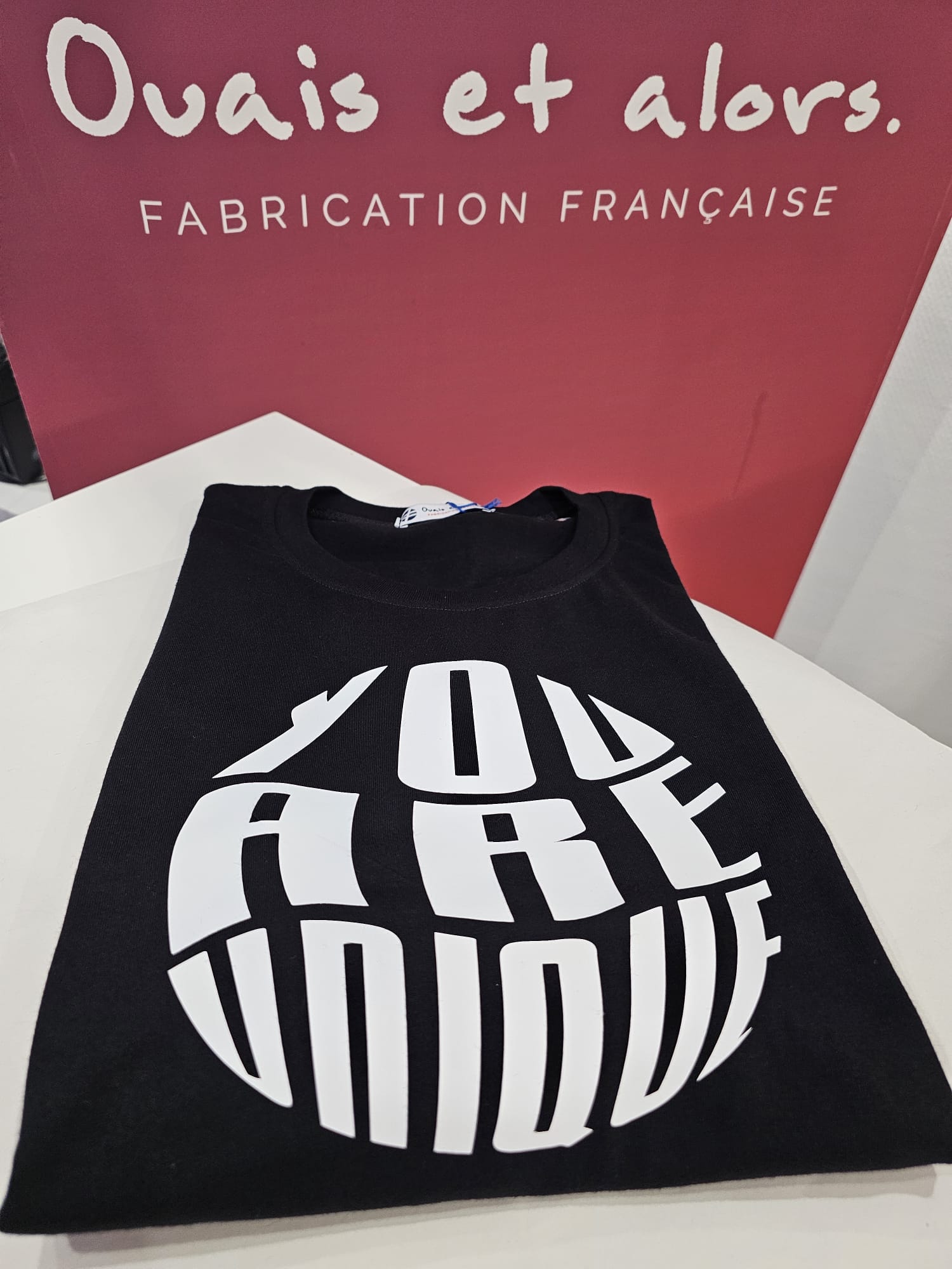 T-SHIRT UNISEXE NOIR, « You are unique » floqué blanc, confectionné de façon responsable, en France.
