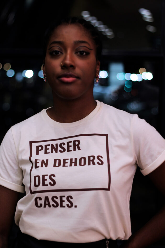 T-SHIRT UNISEXE, teinte naturelle écru « penser en dehors des cases » floqué noisette, confectionné de façon responsable, en France.