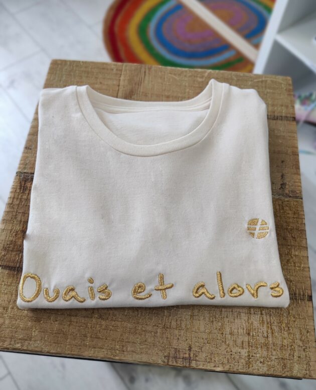 T-SHIRT UNISEXE, teinte écru « Ouais et alors » brodé doré, confectionné de façon responsable, en France .